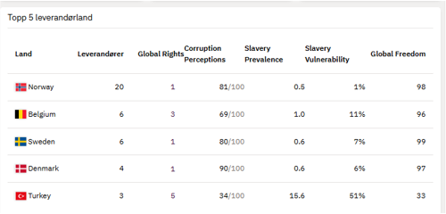 List of supplier countries. Norway: 20 suppliers. Belgium 6. Sweden 6. Denmark 4.