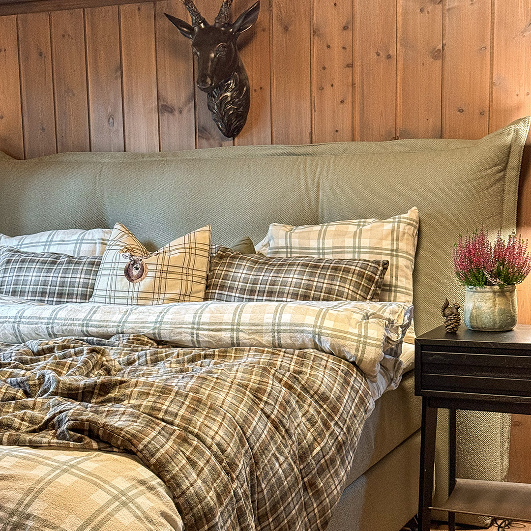 Flanellsengetøy gir en lun og varm følelse som passer perfekt til hyttelivet. Kombiner med grove strikkede pledd, lin og ull for et levende uttrykk. Et saueskinn på gulvet tilfører både tekstur og komfort.