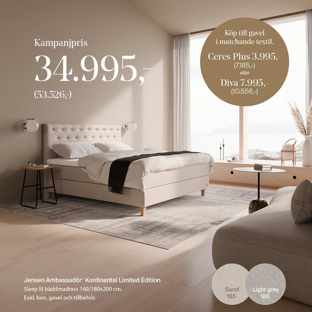 Få ett riktigt bra pris på Ambassadör+ Kontinental Limited Edition – för dig som vill vakna utvilad och redo för dagen. Erbjudandet gäller hos alla Jensen-återförsäljare i Sverige.