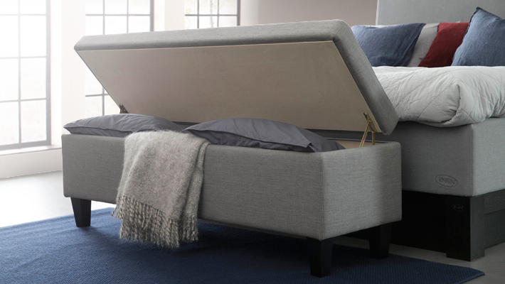 Stauraum kann man nie genug haben, und warum soll man den nicht mit einem Sitzplatz im Schlafzimmer kombinieren? Bei der Bettbank von Jensen brauchen Sie nur die Klappe zu öffnen, um Ihre Schuhsammlung oder Ihren Berg Lieblingsjeans zu verstauen. Machen Sie diese Bank zu einer schönen Verlängerung des Bettes, indem Sie für beides den gleichen Bezugsstoff wählen.