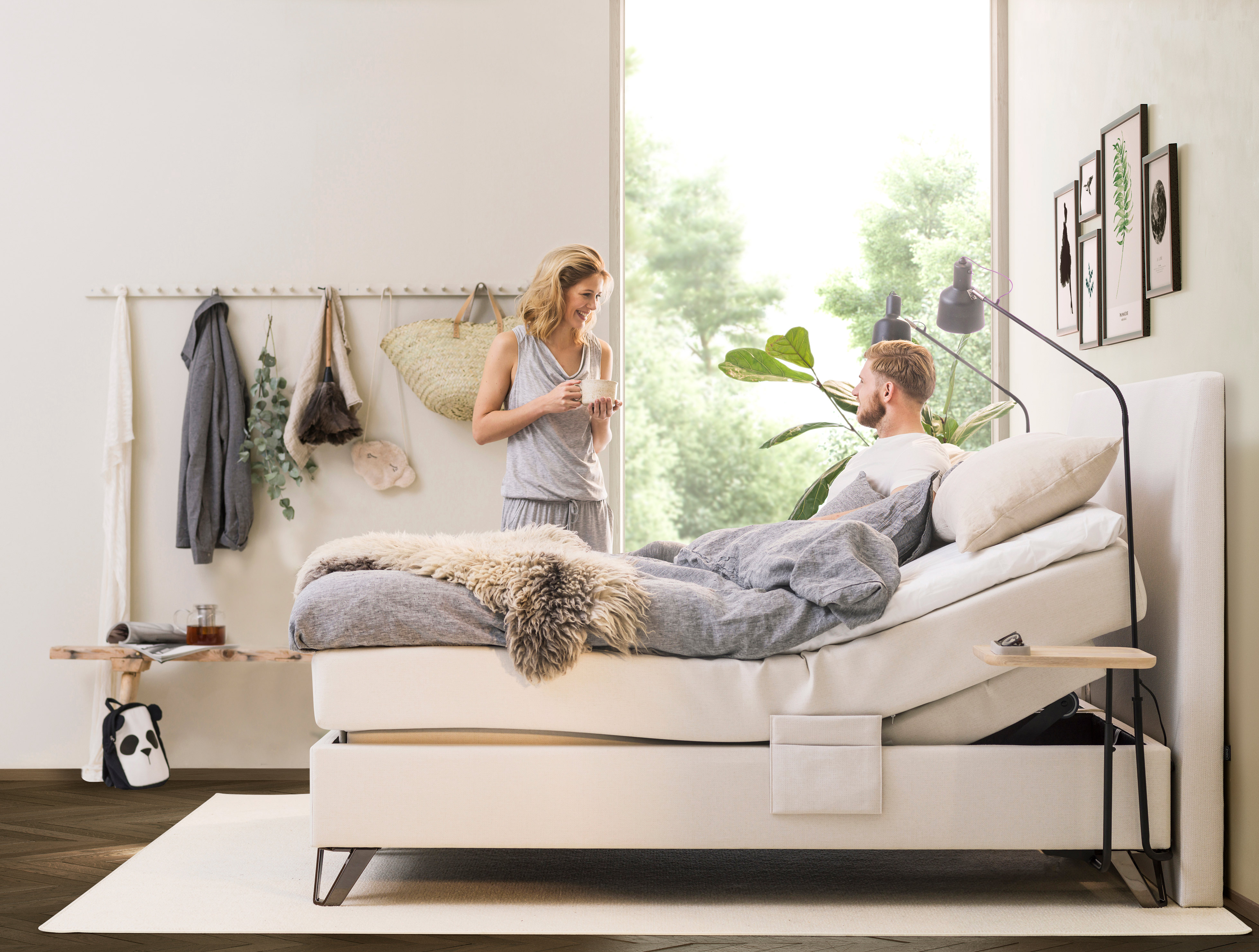 However, a bed designed for quality sleep is not an ergonomically ideal workspace, as long as it remains horizontal. That is why we recommend an adjustable bed that makes it comfortable to sit and read, eat breakfast, watch television or surf the web. A single click on the remote control gives you the desired bed position, and you can even adjust the bed with an app on your mobile. This makes it possible to spend hours sitting in bed, while the spine and neck is being properly supported.